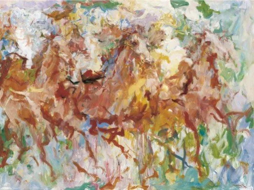 Aside from a few individual colour blocks, most of the colours used blend together in a unique flow of brushwork, indistinguishable from one another. While they each express themselves boldly, they also create an unexpected sense of harmony. In addition to coordinating colours, BEI employs short, brisk brush strokes to convey instantaneous movement, almost allowing one to feel the vibrations of hooves striking the ground. Besides, he uses fluid long strokes to express overall flow, perfecting the rhythm of the painting.