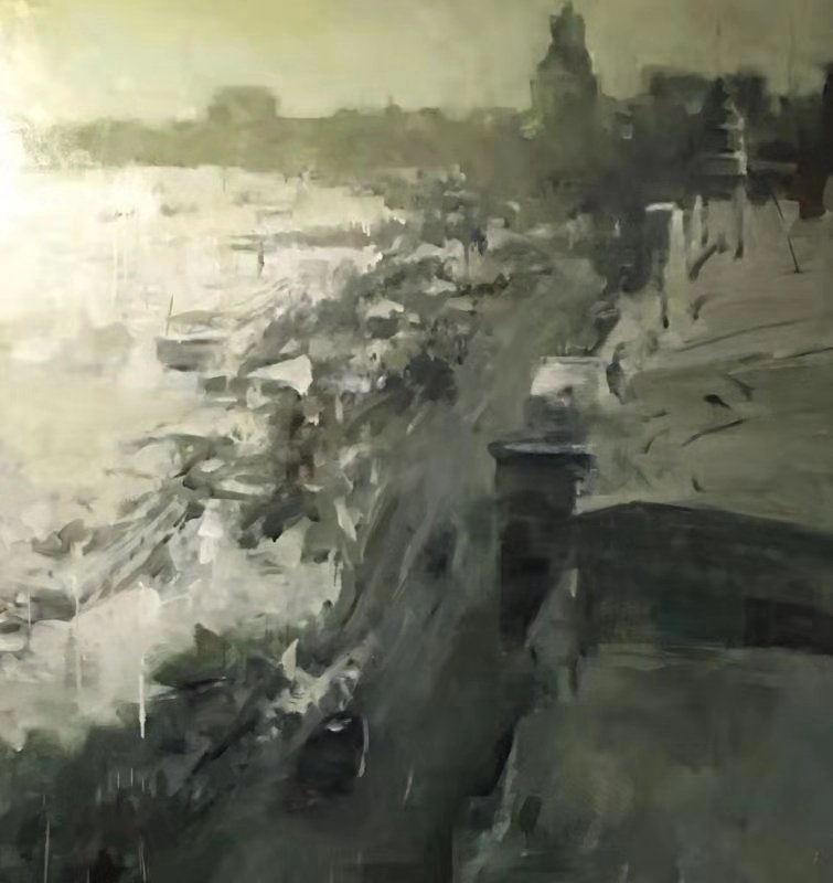 Secondly, BEI liberates colour from mere descriptive function, bringing it into the realms of phenomenology and emotion. Take the Old Shanghai series as an example: the interweaving of grey-blues, warm golds, and deep reds is not a scientific record of the sky’s light at a specific moment, but a shaping of psychological time—of “memory” itself. Colour here becomes the equivalent of time’s texture: vague yet warm, both clear and hazy, just as memory itself intertwines certainty with reverie. This tendency recalls Monet’s late immersion in light and colour, yet BEI’s colour carries a greater weight of historical psychology. As T.J. Clark noted, modern painting made colour a central medium of experience; BEI goes further, transforming colour into a visual vessel condensing historical time and the collective unconscious. He advances the Shanghai School’s artistic intuition regarding the sensitivity to “modern time” into philosophical expression. The Shanghai School, born of treaty-port culture, inherently possessed a knack for capturing the instantaneity of urban life; BEI’s “Old Shanghai” imbues this theme with profound emotional depth. With the painter’s bodily sensibility, he translates the urban psychology described by Georg Simmel—the fragmentation of sensation and nostalgic sentiment—into a lyrical epic about loss and preservation. That very ambiguity of colour and brushstroke is not an escape, but rather an aesthetic strategy to resist temporal entropy: solidifying the fleeting instant into an eternal image.