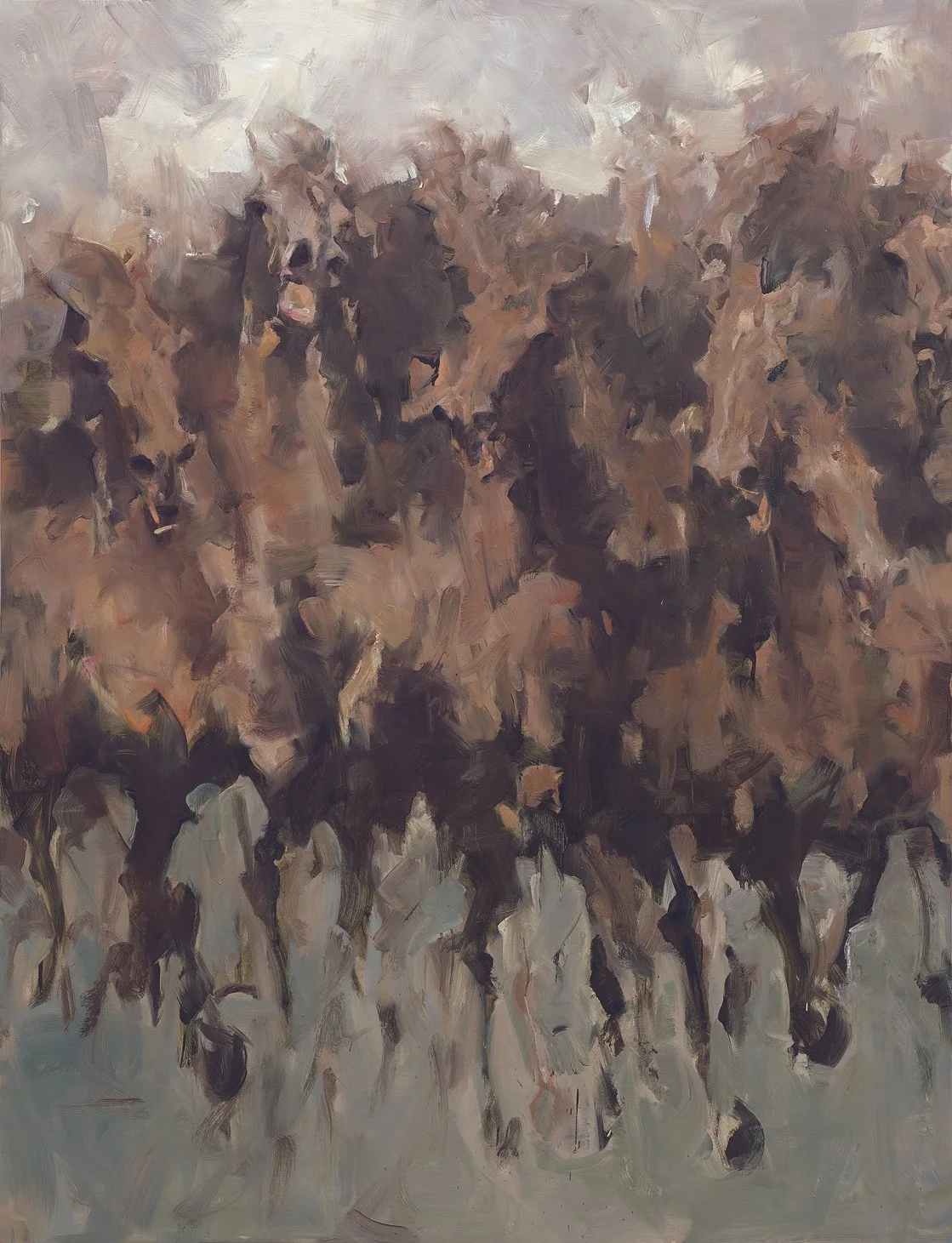 Firstly, BEI’s practice manifests in the liberation of “form.” He does not pursue static completeness of image, but focuses on the process of an image’s generation and its state of presence. To this end, he often employs brushwork that omits details and accentuates dynamic momentum, allowing the brushstroke itself to surpass its descriptive function and become a direct inscription of the mind’s trace. This technique shares a formal affinity with what Wölfflin described as the Baroque “painterly” (malerisch) visual tendency—abandoning clear contours in pursuit of a tremulous fusion of the visual whole. Yet its spiritual roots lie closer to the Chinese aesthetic tradition of “transcending form to capture likeness.” BEI’s deconstruction and recombination of imagery actually mirrors Zhuangzi’s dismantling of conventional cognitive patterns: the first impression of a painting may still be a horse, a person, a flower; yet upon sustained gazing, the specific physical form gradually dissipates, replaced by a haze of time, an intensity of emotion, and an eruption of life. The concrete “thing” dissolves, the universal “idea” emerges—this is the visual realisation of “the equality of things”: stripping away names and appearances to perceive the fundamental truth directly.